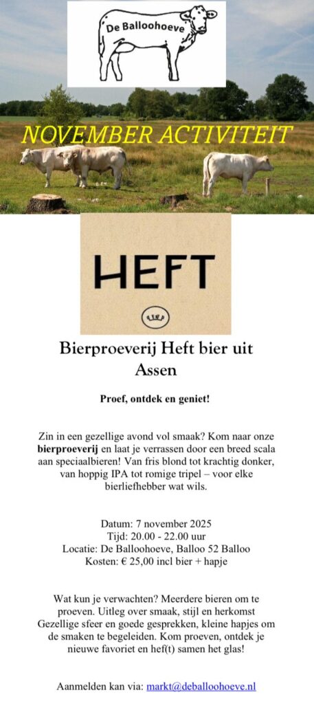 BALLOO – Op vrijdag 7 november organiseert De Balloohoeve in Balloo een bijzondere bierproeverij met de ambachtelijke bieren van Brouwerij Heft uit Assen. Tussen 20.00 en 22.00 uur kunnen bezoekers proeven van verschillende speciaalbieren, begeleid door uitleg over smaak, stijl en herkomst. De avond kost € 25,-, inclusief hapjes.