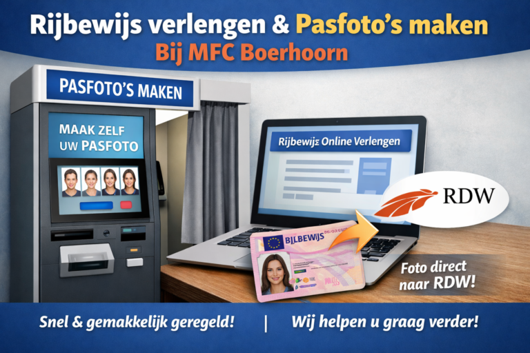 Bij MFC Boerhoorn kunt u uw rijbewijs online verlengen en direct een officiële pasfoto laten maken. De foto wordt automatisch doorgestuurd naar het RDW. Snel, eenvoudig en dichtbij geregeld.