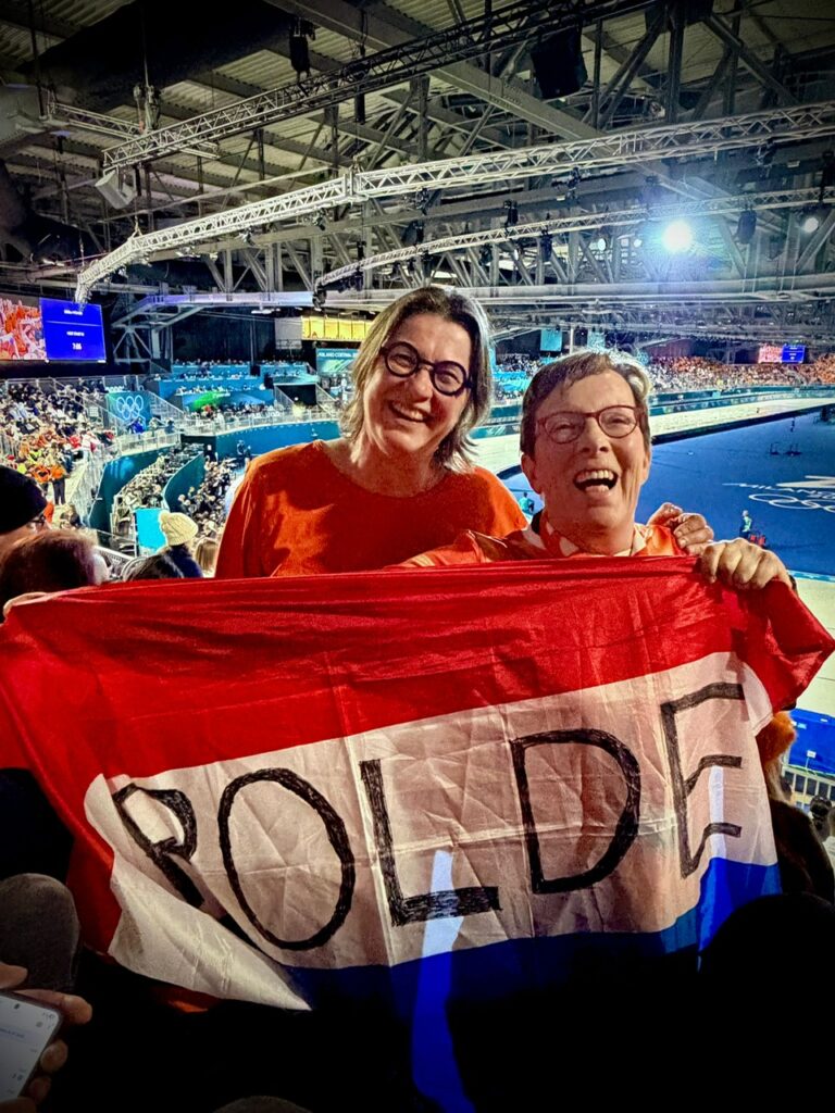 Janny Dekker en Frederiek Dilling zijn opnieuw aanwezig bij het schaatsen in Milaan, waar zij het olympisch goud van Leerdam en zilver van Kok meevierden met de Rolder vlag.