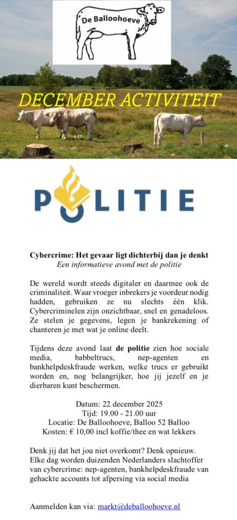 De Balloohoeve organiseert daarom op 22 december een informatieve avond over cybercrime, met een presentatie door de Politie. Agenten laten op een heldere en praktijkgerichte manier zien hoe moderne oplichters opereren: via sociale media, babbeltrucs, nep-agenten, bankhelpdeskfraude en andere digitale trucs. Bezoekers krijgen inzicht in waarschuwingssignalen én handvatten om zichzelf en hun omgeving beter te beschermen.