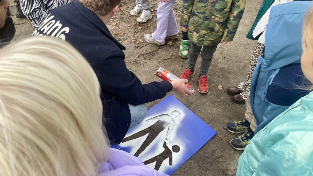Vanochtend hebben leerlingen van de groepen 4a en 7a uit Rolde een actieve bijdrage geleverd aan de verkeersveiligheid rondom het schoolplein. Gewapend met natuurlijke kruitverf verduidelijkten zij de loop- en fietsroutes rondom de school. De actie volgde op een ‘inspectie’ van de verkeerscommissie, wethouder Heling en beleidsadviseur Schaap van de gemeente Aa en Hunze. Hun conclusie was duidelijk: het is vaak chaotisch rondom het schoolplein – met onduidelijke parkeervakken, loop- en fietsroutes en bebording. Tijd om daar iets aan te doen en dus leverde de gemeente enkele spuitbussen!