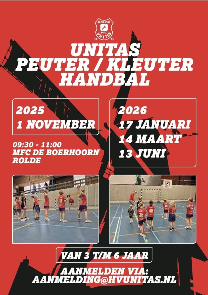 ROLDE – Handbalvereniging Unitas organiseert dit seizoen opnieuw een serie peuter- en kleutertrainingen in sporthal De Boerhoorn in Rolde. Vier ochtenden lang kunnen kinderen van 3 tot en met 6 jaar spelenderwijs kennismaken met handbal.