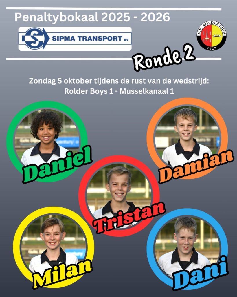 Tijdens de rust van Rolder Boys 1 – Musselkanaal 1 vindt de tweede ronde van de penaltyserie plaats. De volgende vijf spelers zijn uitgenodigd om elk vijf penalty’s te nemen: