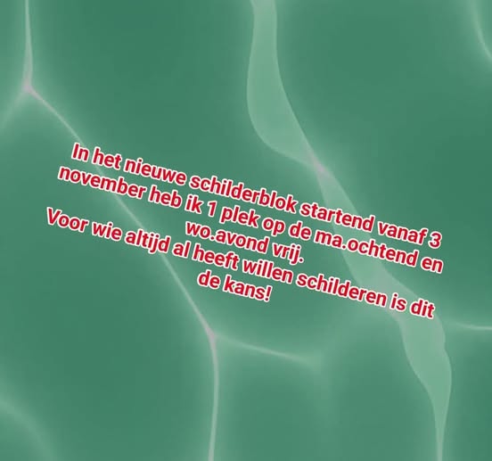 In het sfeervolle Atelier de Tippe aan de Banderschulte 10 in Rolde geeft beeldend kunstenaar Rosalinde Huizinga schilderlessen aan kleine groepen liefhebbers. Vanaf 3 november komt er weer één plek vrij op de maandagochtend en één op de woensdagavond.
