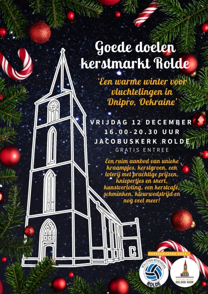 Op vrijdag 12 december vindt de jaarlijkse Goede Doelen Kerstmarkt plaats bij de Jacobuskerk in Rolde, van 16.00 tot 20.30 uur. Dit jaar staat de markt in het teken van ‘Een warme winter voor vluchtelingen in Dnipro, Oekraïne’.